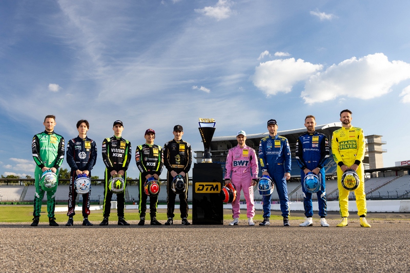 München. Dieses Finale verspricht einen fulminanten Titel-Thriller: Gleich neun Fahrer kämpfen am Wochenende (3. bis 5. Oktober) auf dem Hockenheimring Baden-Württemberg um die DTM-Krone. Vor dem großen Showdown trafen Tabellenführer Lucas Auer (A/Mercedes-AMG Team Landgraf) und seine Verfolger Jordan Pepper (ZA/TGI Team Lamborghini by GRT), BMW-Pilot René Rast (Bregenz/Schubert Motorsport), Maro Engel (Monaco/Mercedes-AMG Team Winward Racing), Porsche-Fahrer Ayhancan Güven (TR/Manthey EMA), Marco Wittmann (Fürth) im BMW von Schubert Motorsport, Porsche-Fahrer Thomas Preining (A/Manthey EMA), Jack Aitken (GB) vom Ferrari-Team Emil Frey Racing sowie Jules Gounon (Mercedes-AMG Team Mann-Filter) am Donnerstag in Hockenheim aufeinander – bei einem Fotoshooting mit der Meistertrophäe.