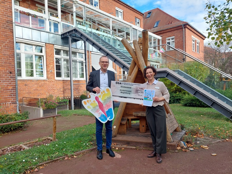 Magdeburg, 22. Oktober 2025. Die Mitarbeitenden der Öffentlichen Versicherungen Sachsen-Anhalt (ÖSA) haben im Rahmen einer Tombola zum diesjährigen Betriebsfest für das Kinderhospiz in Magdeburg gesammelt – mit beeindruckendem Ergebnis. Dank des großen Engagements der ÖSiAnerinnen und ÖSiAner sowie zahlreicher Vertriebspartnerinnen und Vertriebspartner konnten 1.516 Euro gesammelt werden. Der Vorstand des regionalen Versicherers stockte diesen Betrag auf, so dass gestern insgesamt 3.000 Euro an das Kinderhospiz in Magdeburg übergeben werden konnten.