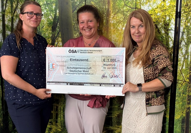 Magdeburg, 16. Juli 2025. Mitarbeitende der Öffentlichen Versicherungen Sachsen-Anhalt (ÖSA) haben wieder viel Herz gezeigt und den Internationalen Frauentag zum Anlass genommen, um gemeinsam Gutes zu tun. Unter dem Motto „Gesundheit, Genuss und dabei Grün“ wurde von den ÖSiAnerinnen und ÖSiAnern Geld gesammelt. Dieses kommt der Schutzgemeinschaft Deutscher Wald (SDW) zugute, die sich seit Jahrzehnten für den Erhalt und die Pflege unserer heimischen Wälder einsetzt und damit einen wichtigen Beitrag für kommende Generationen leistet. Heute haben Sabine Maihold, ehrenamtliche Gleichstellungsbeauftragte der ÖSA, und ihre Vertreterin Janett Ebecke, den Scheck in Höhe von 1.000 Euro an Anne-Katrin Blisse, Landesgeschäftsführerin der SDW Sachsen-Anhalt, übergeben.