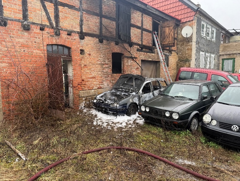 Durch Zeugen wurde ein Brand eines PKW gemeldet. Der von dem Kraftfahrzeug ausgehende Brand, drohte auf eine nebenstehende Scheune überzugreifen. Das zügige Eingreifen der Feuerwehr verhinderte ein Übergreifen des Feuers auf die Scheune. Personen kamen bei dem Brand nicht zu schaden. Die Brandursache ist derzeit unbekannt und Gegenstand der weiteren Ermittlungen.