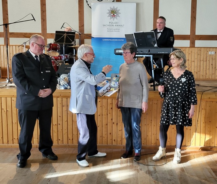 Mit Witz und Charme begleitete Sicherheitsberater KR a.D. Lothar Schirmer die Senioren durch den Abend und klärte u.a. über Betrugsmaschen, Enkeltrick – Schockanrufe und Schutz vor Einbrüchen auf. Für die musikalische Unterhaltung sorgte die Combo des Landespolizeiorchesters.