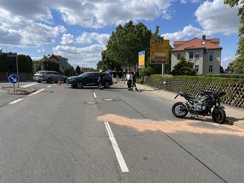 Bad Suderode – Am 28.06.2025, gegen 16:00 Uhr befuhr ein 40-Jahre alter Mann aus Beyernaumburg (Landkreis Mansfeld – Südharz) mit seinem Krad Kawasaki die Bahnhofstraße aus Richtung Friedrichsbrunn kommend und beabsichtigte nach rechts in die Chausseestraße in Richtung Gernrode abzubiegen. Während des Abbiegevorganges geriet er aus ungeklärter Ursache auf den Fahrstreifen des Gegenverkehrs und kollidierte mit einem Pkw Peugeot, der gerade auf der Chausseestraße in Richtung Neinstedt unterwegs war.  Der Pkw Peugeot wurde von einem 40-jährigen Mann aus Ballenstedt gesteuert.