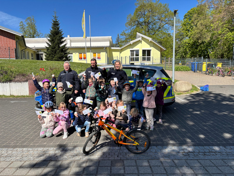Ein besonderes Highlight war ein Experiment mit einem rohen Ei im Fahrradhelm, das anschaulich die Schutzwirkung eines Helms demonstrierte. Nach bestandener „Prüfung“ erhielten alle Kinder einen Fahrradpass sowie einen „Fahrradprüfung – bestanden“-Button. Die Polizei bedankt sich für das große Interesse und die aktive Teilnahme der Kinder und wünscht allen eine sichere Teilnahme am Straßenverkehr.