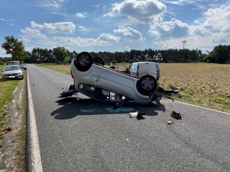 Die Fahrerin eines Pkw Renault befuhr die K 1214 in Richtung Pietzpuhl. Hierbei ĂŒbersah sie einen am Straßenrand geparkten Pkw und touchierte diesen an der hinteren linken Fahrzeugseite. Durch den Aufprall bekam der Renault einen Drall und ĂŒberschlug sich ein Mal und kam auf der Fahrbahnmitte auf dem Dach zum Stillstand. Die beiden Insassen des Fahrzeugs konnten sich selbst nicht aus dem Fahrzeug befreien. Ein Zeuge eilte herbei, durchtrennte die Gurte der Insassen und zog sie aus dem Fahrzeug. Die beiden 72- und 81 Jahre alten Damen wurden leicht verletzt ins Krankenhaus eingeliefert. An den Fahrzeugen entstand Totalschaden.