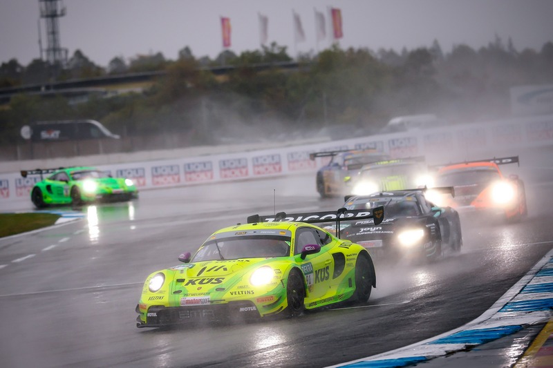 Beim Start zum vorletzten Meisterschaftslauf auf dem Hockenheimring sorgte starker Regen für schwierige Bedingungen. Schon im ersten Umlauf verlor Pole-Setter Ben Green (GB/Emil Frey Racing) nach einem Verbremser die Führung an seinen Teamkollegen Jack Aitken (GB) und musste kurze Zeit später auch Preining vorbeiziehen lassen. Der Österreicher spielte danach auf nasser Fahrbahn seine Stärken und die seines Neunelfers voll aus, übernahm nach einem gekonnten Überholmanöver in Umlauf acht die Führung und setzte sich mit schnellen Rundenzeiten von der Konkurrenz ab. Auch Feller und Schuring gingen an Green vorbei, der immer weiter zurückfiel. Unglücklich verlief das Rennen auch für Jordan Pepper (ZA/TGI Team Lamborghini by GRT): Der Lamborghini-Pilot schied nach einer Berührung mit einem anderen Fahrzeug bereits in der vierten Runde aus, bleibt als Tabellensechster aber im Kreis der Titelkandidaten.