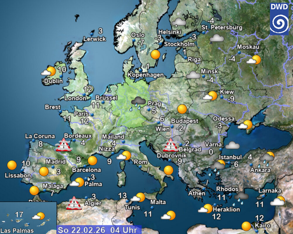 Heute Früh von Westen neue, sich rasch ostwärts ausbreitende Regenfälle. Frühwerte 10 bis 1 Grad. tagsüber verbreitet stark bewölkt bis bedeckt. Vor allem in der Nordhälfte regnerisch, sonst nur zeit- und gebietsweise etwas Regen, dazwischen aber auch längere trockene Phasen, ganz im Süden mit Auflockerungen. Höchstwerte 5 bis 15 Grad. Mäßiger West- bis Südwestwind, auf den Bergen stürmisch. (DWD)