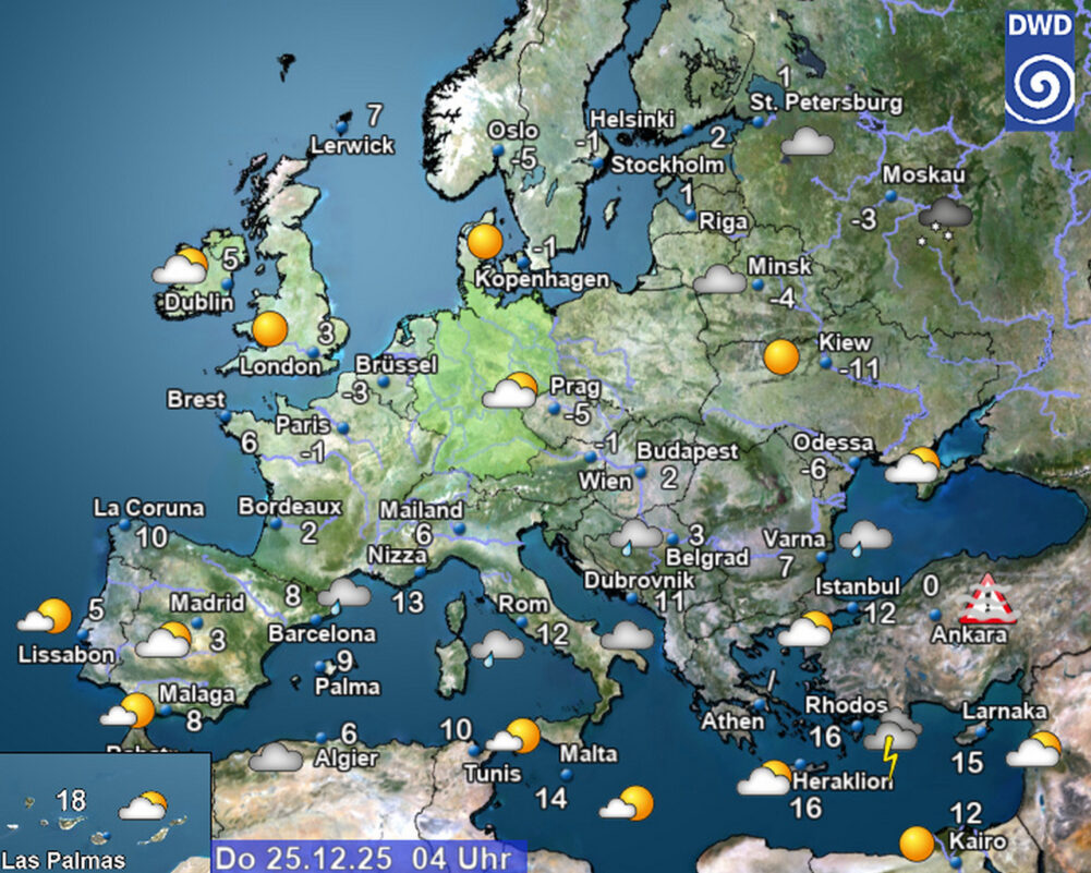 Heute vielfach Sonnenschein und trocken. Nur an der Grenze zu Dänemark, im Thüringer Becken und vom Bodensee bis zur Donau teils zäher Hochnebel und kaum Sonne. Vielerorts Dauerfrost bei 0 bis -4, Thüringer Becken um -6 Grad. Im Westen und Südwesten sowie an den Küsten 0 und +4 Grad. Mäßiger im Westen auch noch vereinzelt starke böiger Ost- bis Nordostwind, weiter nachlassend. Im höheren Bergland anhaltend stürmisch. (DWD)