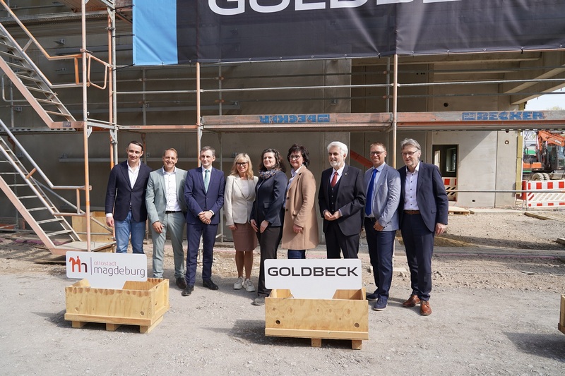 Nach Magdeburgs Oberbürgermeisterin Simone Borris sprachen beim Richtfest Sachsen-Anhalts Bildungsminister Jan Riedel und Goldbeck-Niederlassungsleiter, Thomas Kolley. Im Anschluss haben die beiden verantwortlichen Projektleiterinnen Anja Strehlow vom Eigenbetrieb Kommunales Gebäudemanagement und Katrin Gabriel von Goldbeck den Richtkranz aufgezogen und den Richtspruch vorgenommen.