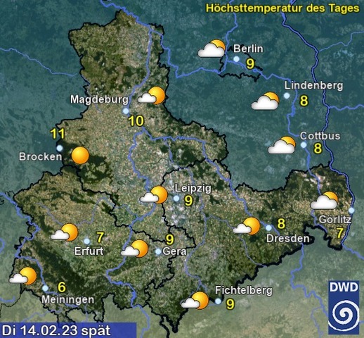 Am Dienstag nach teils zĂ€her Auflösung von Nebel und Hochnebel im SĂŒden heiter, im Norden ĂŒberwiegend stark bewölkt, kein Niederschlag. Höchsttemperaturen 5 bis 9 Grad. Schwacher SĂŒdostwind.
