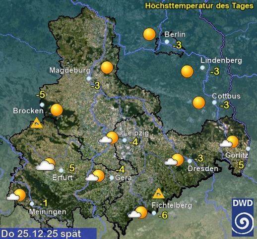 Am Donnerstag (1. Weihnachtsfeiertag) bereits schon überwiegend sonnig oder aber weitere Auflösung der Restbewölkung. Dauerfrost bei -5 bis -1 Grad. Schwacher bis mäßiger Nordostwind, im Oberharz stark böig.
