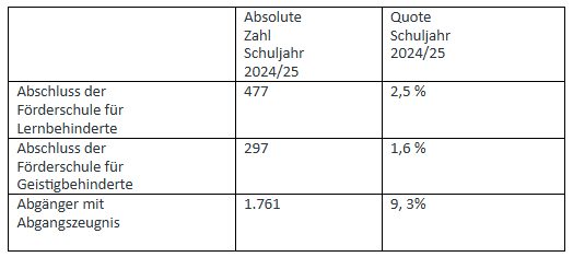 Da an den Förderschulen mit den Schwerpunkten Lernen und geistige Entwicklung die Schülerinnen und Schüler grundsätzlich keinen von der KMK anerkannten, allgemeinbildenden Schulabschluss erreichen, werden Schülerinnen und Schüler, die einen Abschluss an diesen Förderschulen erlangen, von der Quote der Schülerinnen und Schüler mit anerkanntem Abschluss nicht erfasst. Dies ist bei der Quote an Schülerinnen und Schüler ohne einen anerkannten Schulabschluss zu beachten.