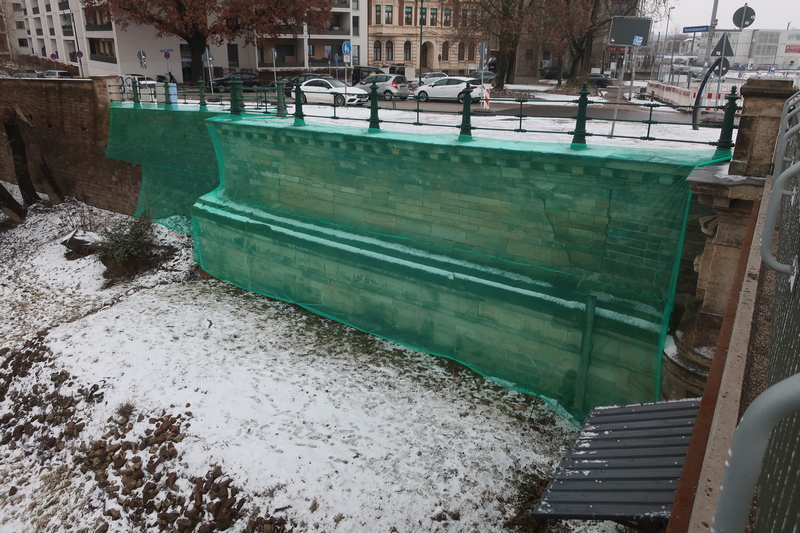 Foto: Stützmauer mit grünem Netz bedeckt (Copyright: Landeshauptstadt Magdeburg)