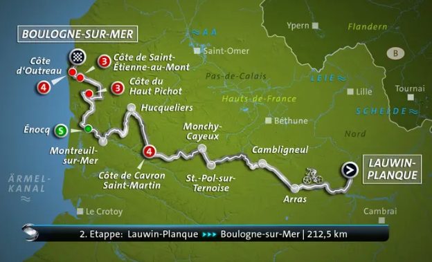 Einschätzung: Der längste Tagesabschnitt der Rundfahrt steht den Fahrern schon auf der zweiten Etappe bevor. Die 212 Kilometer, die im nordfranzösischen Kohlerevier beginnen und am Ufer des Ă„rmelkanals enden, sollten aber alles andere als langweilig werden. Denn das Profil ist durchaus anspruchsvoll. Es geht zunächst wellig dahin, mit ständigen kleinen Aufs und Abs, die Höhenmeter summieren sich. Und am Ende des Tages sind noch einmal zwei knifflige Stiche mit bis zu 15 Prozent Steigung zu erklettern. Bevor das Ziel ebenfalls am Ende eines etwa ein Kilometer langen Anstiegs platziert ist. Da dĂĽrften nur Allround-Sprinter eine Chance haben, eher ist der Tag etwas fĂĽr sogenannte „Puncheure“. Klassiker-Fahrer, die kurz und kraftvoll antreten können.