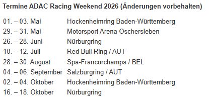 MĂŒnchen. Das Programm fĂŒr 2026 steht: In der sechsten Saison des ADAC Racing werden nahezu alle Arten des automobilen Rundstreckensports auf dieser Plattform vertreten sein. Kernserien bleiben die Porsche Sprint Challenge Deutschland GT3, die Porsche Sprint Challenge Deutschland GT4, die Porsche Endurance Challenge Deutschland, die Spezial Tourenwagen Trophy (STT) sowie der ADAC Tourenwagen Junior Cup, die jeweils bei fĂŒnf bis sechs ADAC Racing Weekends dabei sind. Hinzu kommen noch weitere Serien fĂŒr GT-Fahrzeuge, Tourenwagen und Formelrenner ganz unterschiedlicher Baujahre, die entweder herkömmliche Rennen fahren oder sich in GleichmĂ€ĂigkeitsprĂŒfungen messen.
