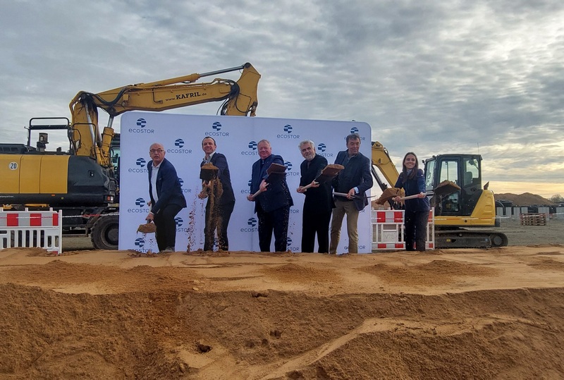Foto: Energieminister Prof. Dr. Armin Willingmann (4.v.l.) setzte gestern gemeinsam mit dem Geschäftsführer der ECO STOR GmbH, Georg Gallmetzer (2.v.l.), Staßfurts Bürgermeister René Zok (3.v.l.), Projektleiterin Jehan Long (r.) sowie Vertretern von Netzbetreiber und Verband den ersten Spatenstich.
